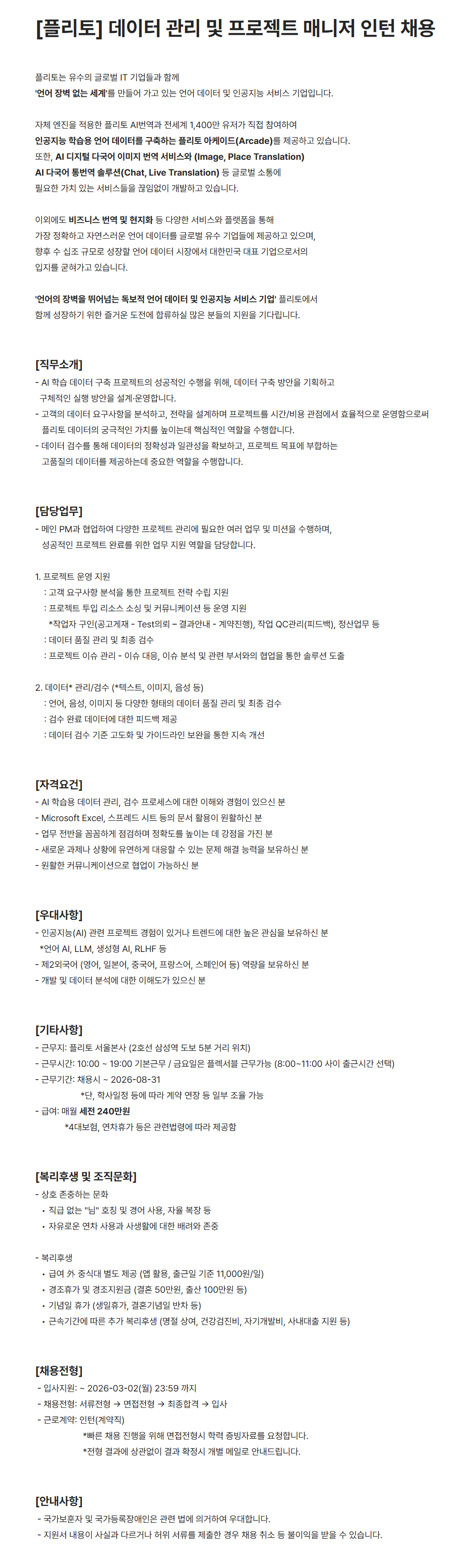[플리토] 데이터 관리 및 프로젝트 매니저 인턴 채용