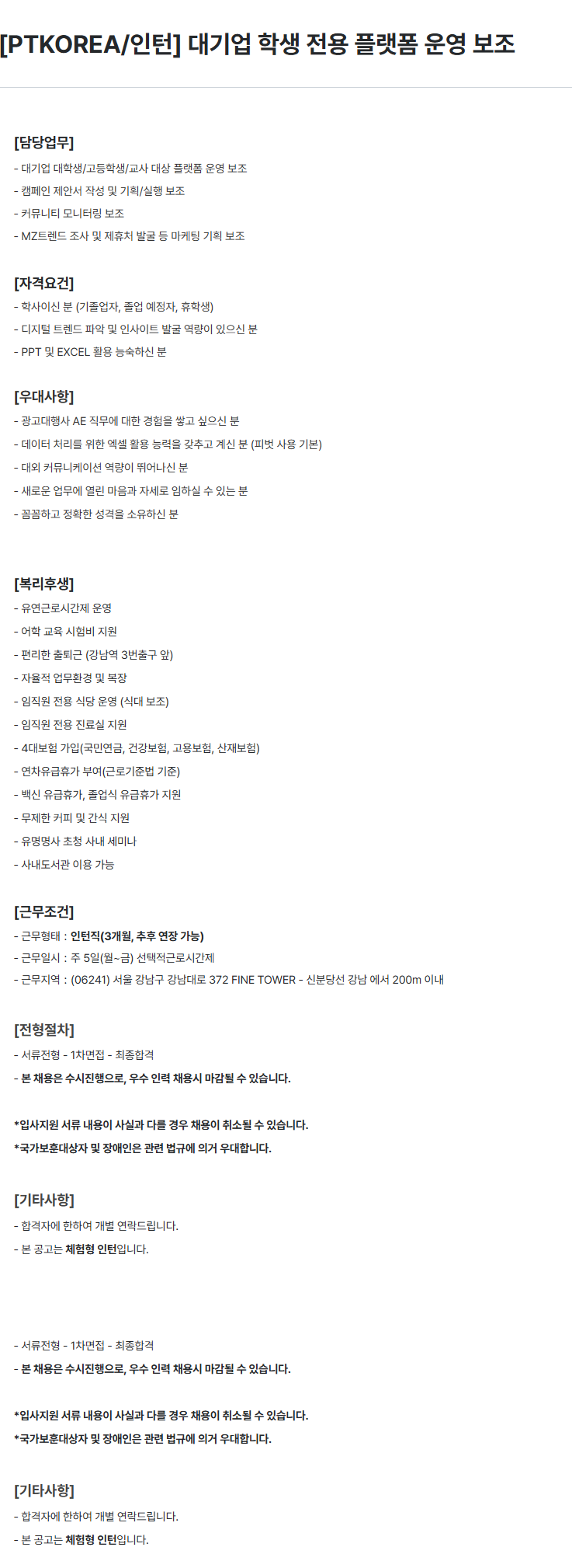[PTKOREA] [인턴] 대기업 학생 전용 플랫폼 운영 보조