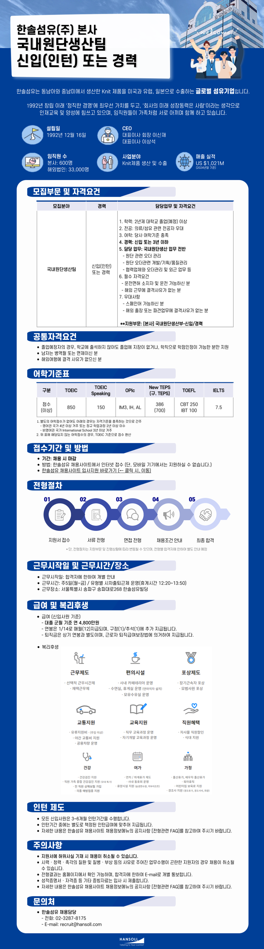 [한솔섬유] 본사 국내원단생산팀 신입(인턴) 또는 경력