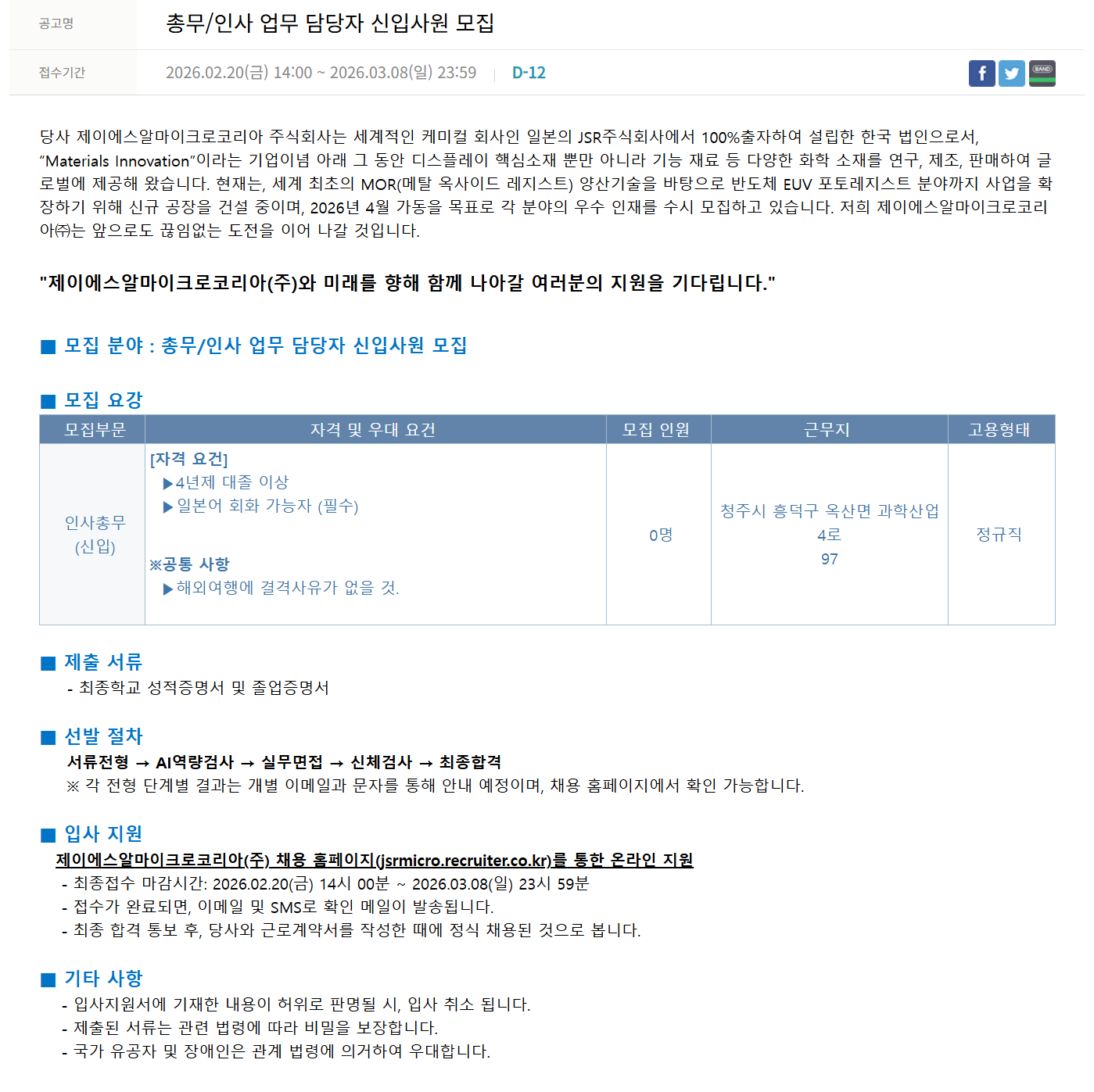 [JSR Micro Korea] 총무/인사 업무 담당자 신입사원 모집