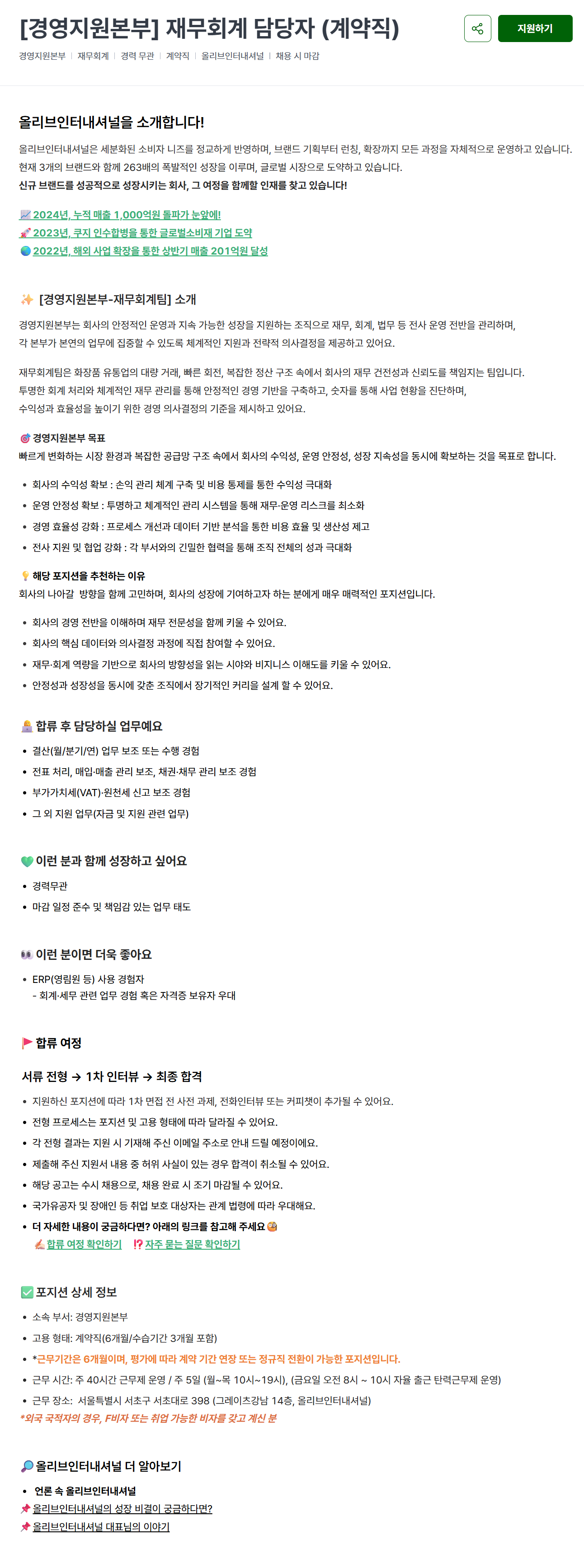 [올리브인터내셔널] [경영지원본부] 재무회계 담당자 (계약직)