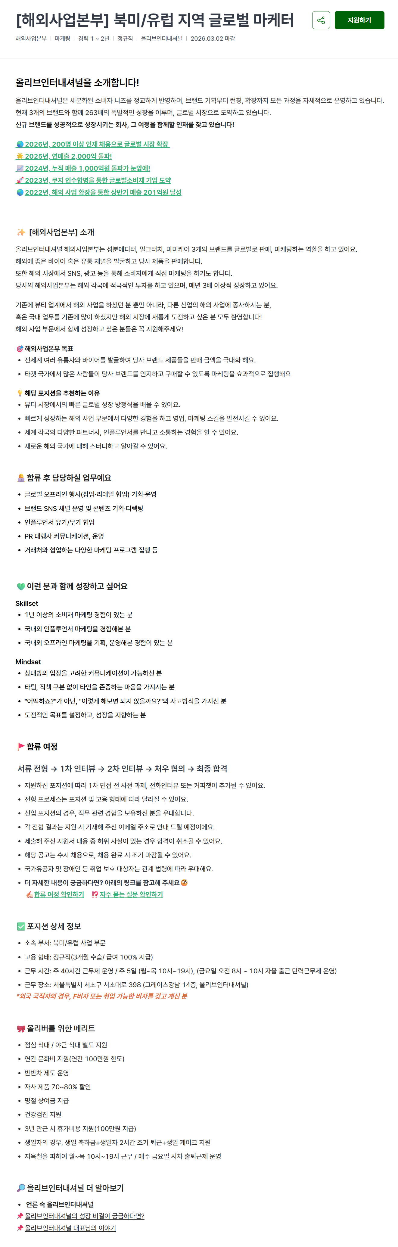 [올리브인터내셔널] [해외사업본부] 북미/유럽 지역 글로벌 마케터