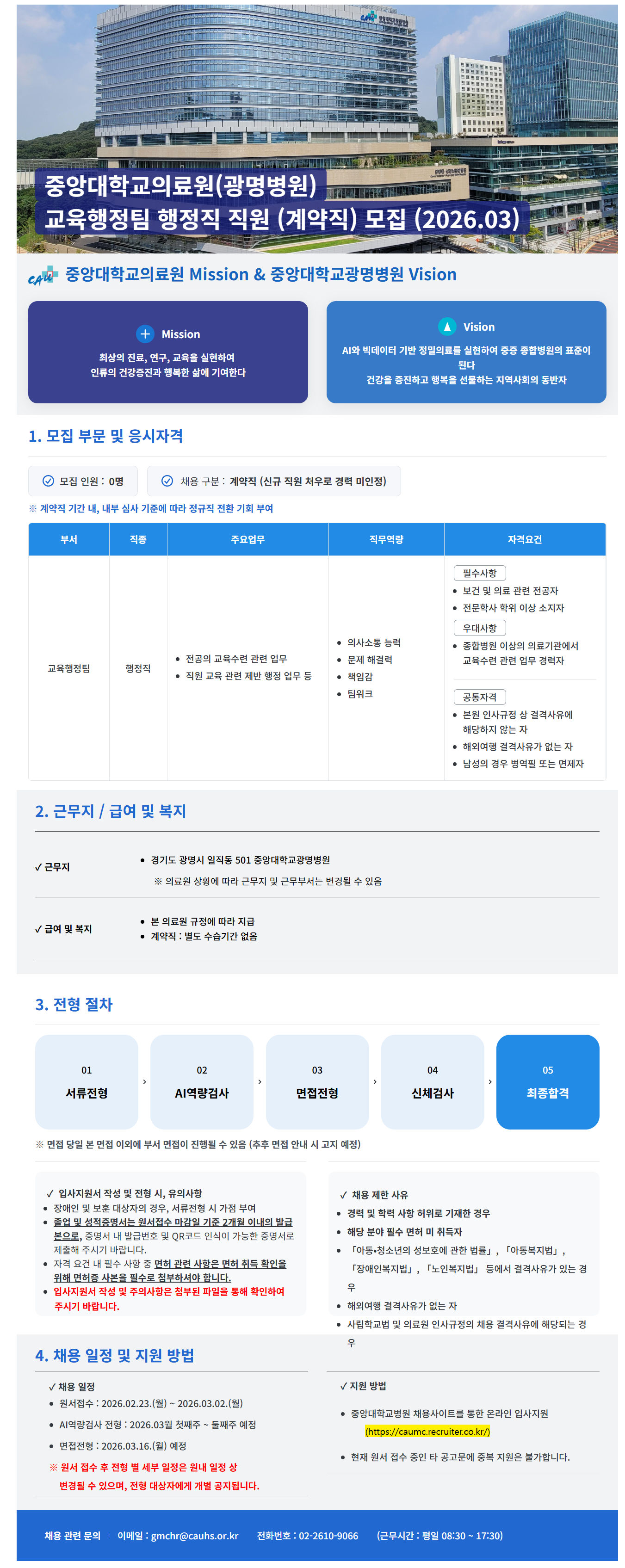 [중앙대학교병원] 중앙대학교의료원(광명병원) 교육행정팀 행정직 직원 (계약직) 모집 (2026.03)