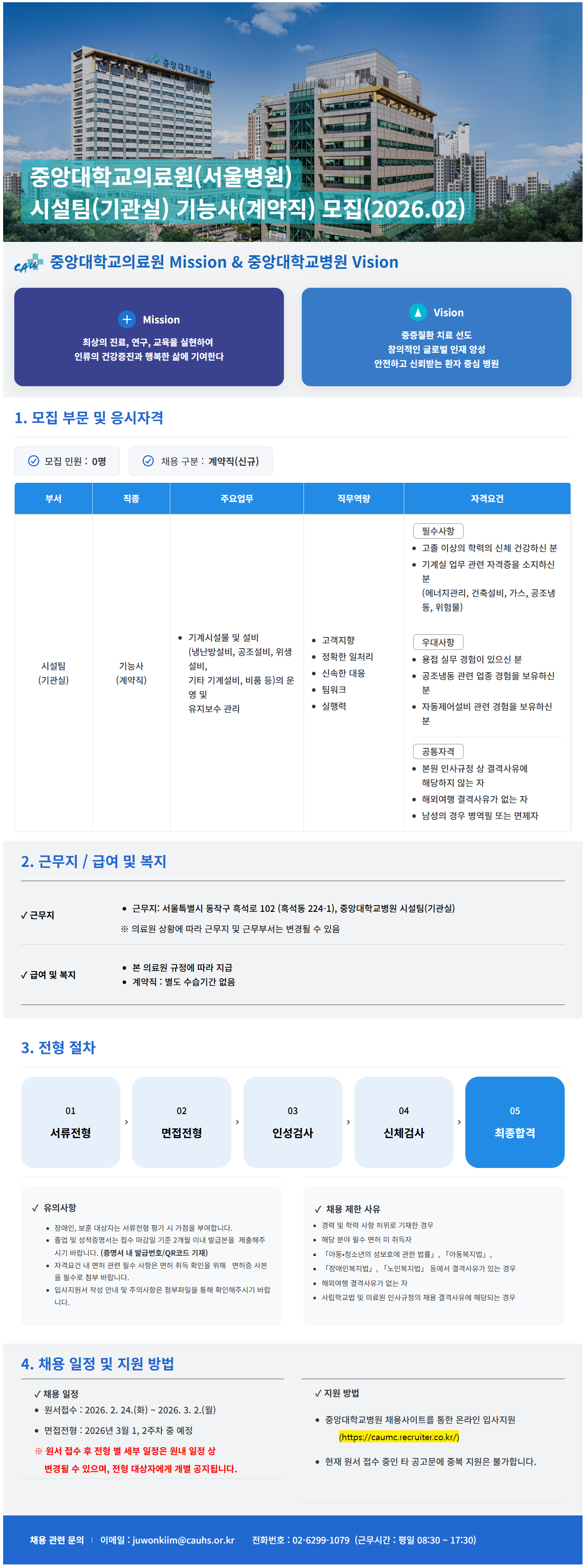 [중앙대학교병원] 중앙대학교의료원(서울병원) 시설팀(기관실) 기능사(계약직) 모집(2026.02)