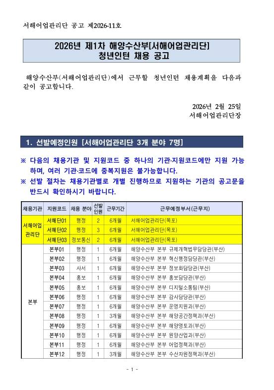 [서해어업관리단] 2026년 제1차 해양수산부(서해어업관리단) 청년인턴 채용공고