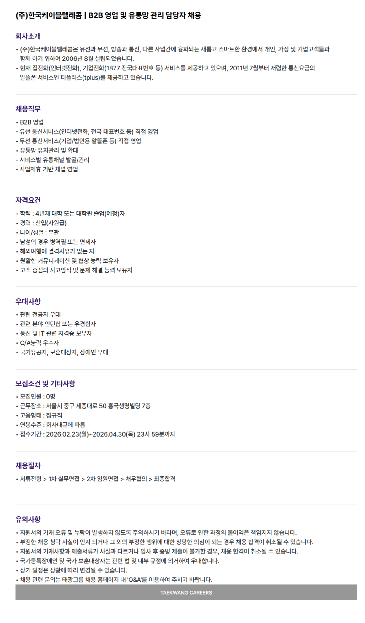 [한국케이블텔레콤] B2B사업팀 영업 및 유통망 관리 담당자 채용(정규직)
