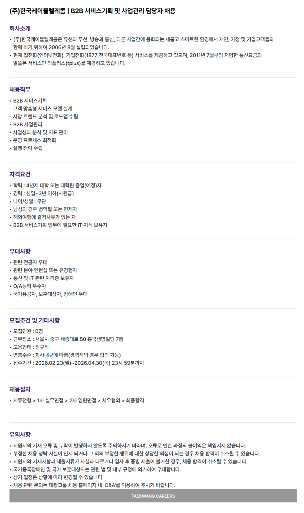 [한국케이블텔레콤] B2B사업기획팀 서비스기획 및 사업관리 담당자 채용(신입)
