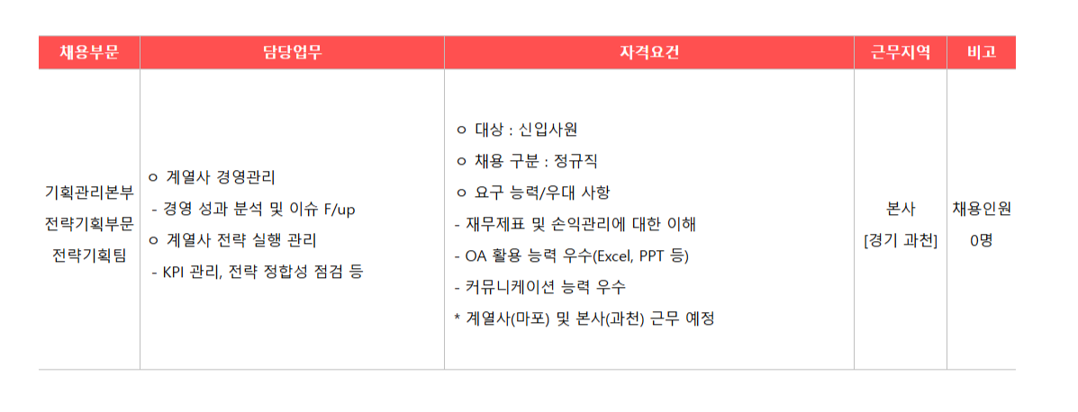 * 계열사(마포) 및 본사(과천) 근무 예정