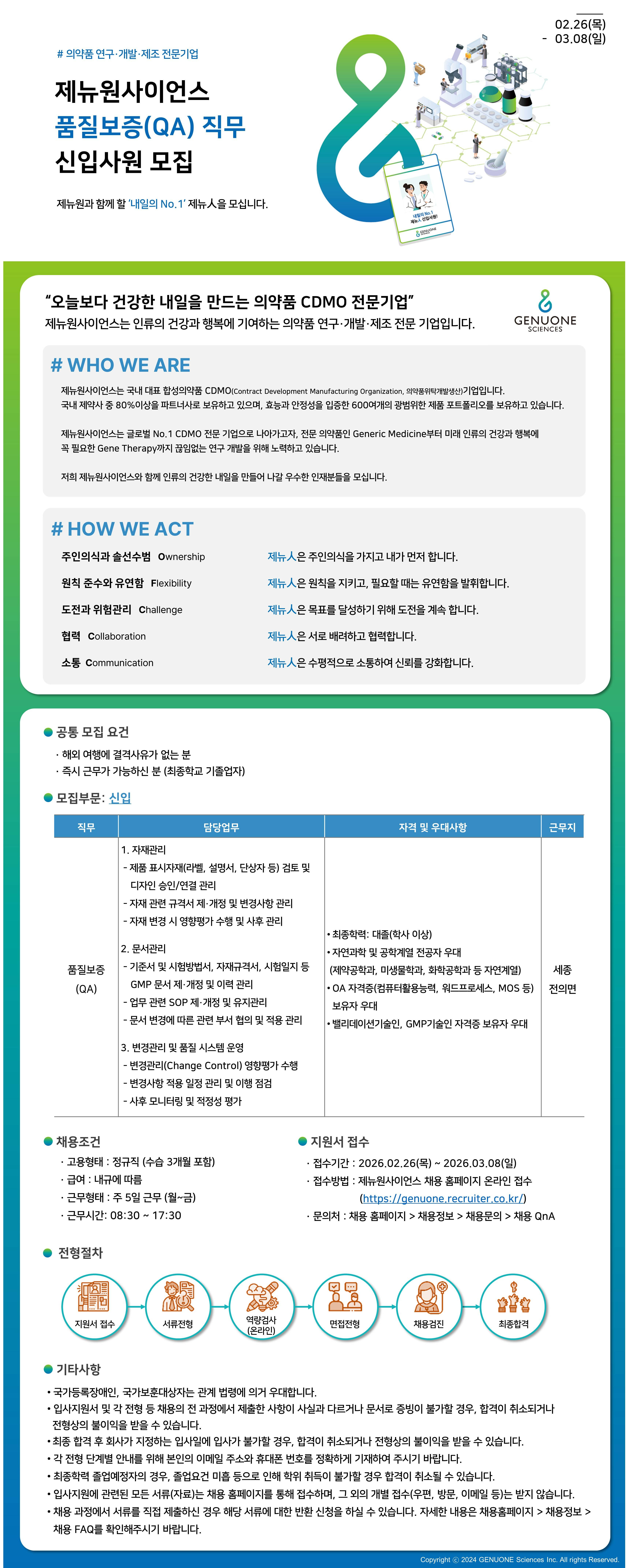 [제뉴원사이언스] 품질보증(QA) 직무 신입사원 모집