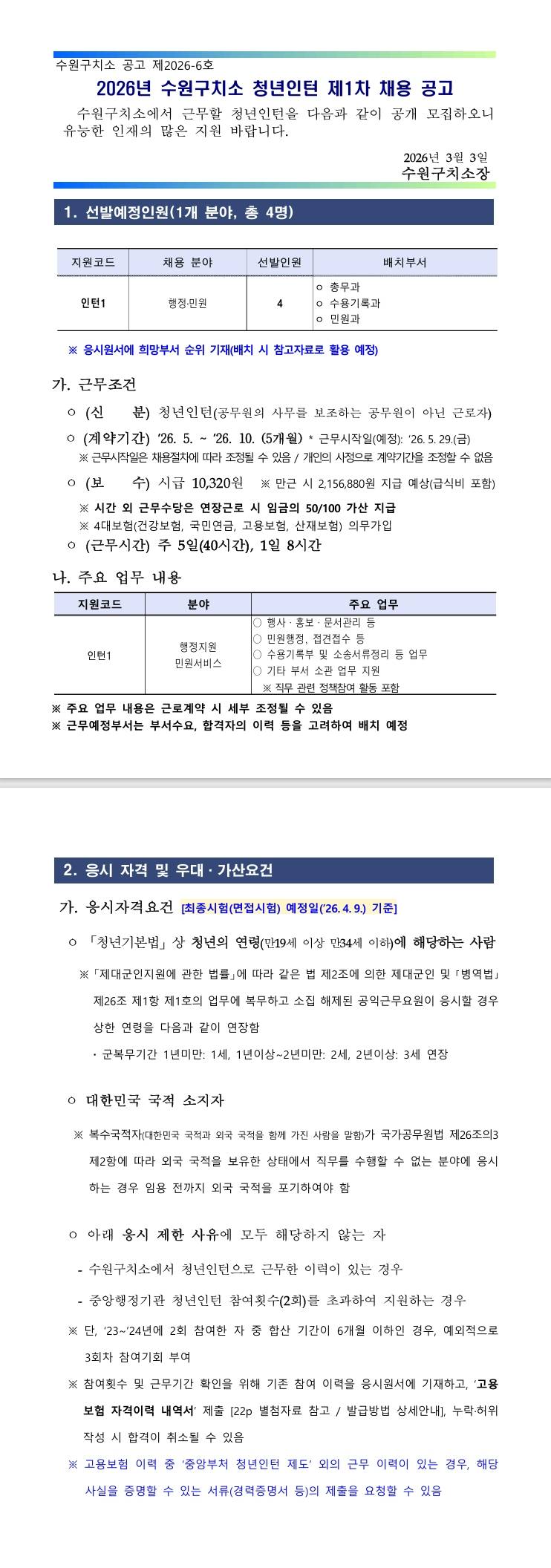 [수원구치소] 2026년 제1차 수원구치소 청년인턴 채용 공고