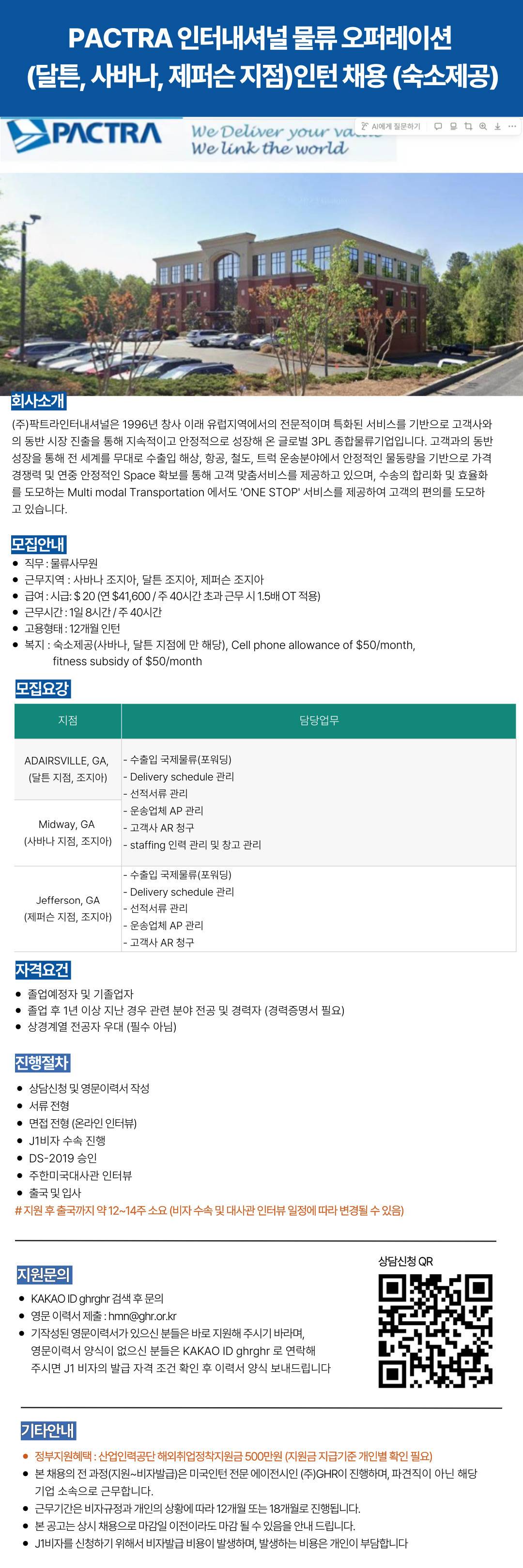 PACTRA 인터내셔널 물류 오퍼레이션 (달튼, 사바나, 제퍼슨 지점)인턴 채용 (숙소제공)