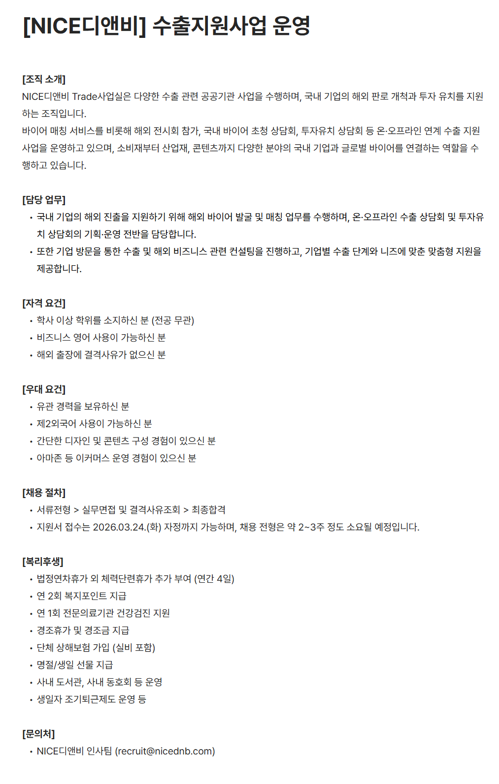 - 지원서 접수는 2026.03.24.(화) 자정까지 가능하며, 채용 전형은 약 2~3주 정도 소요될 예정입니다.