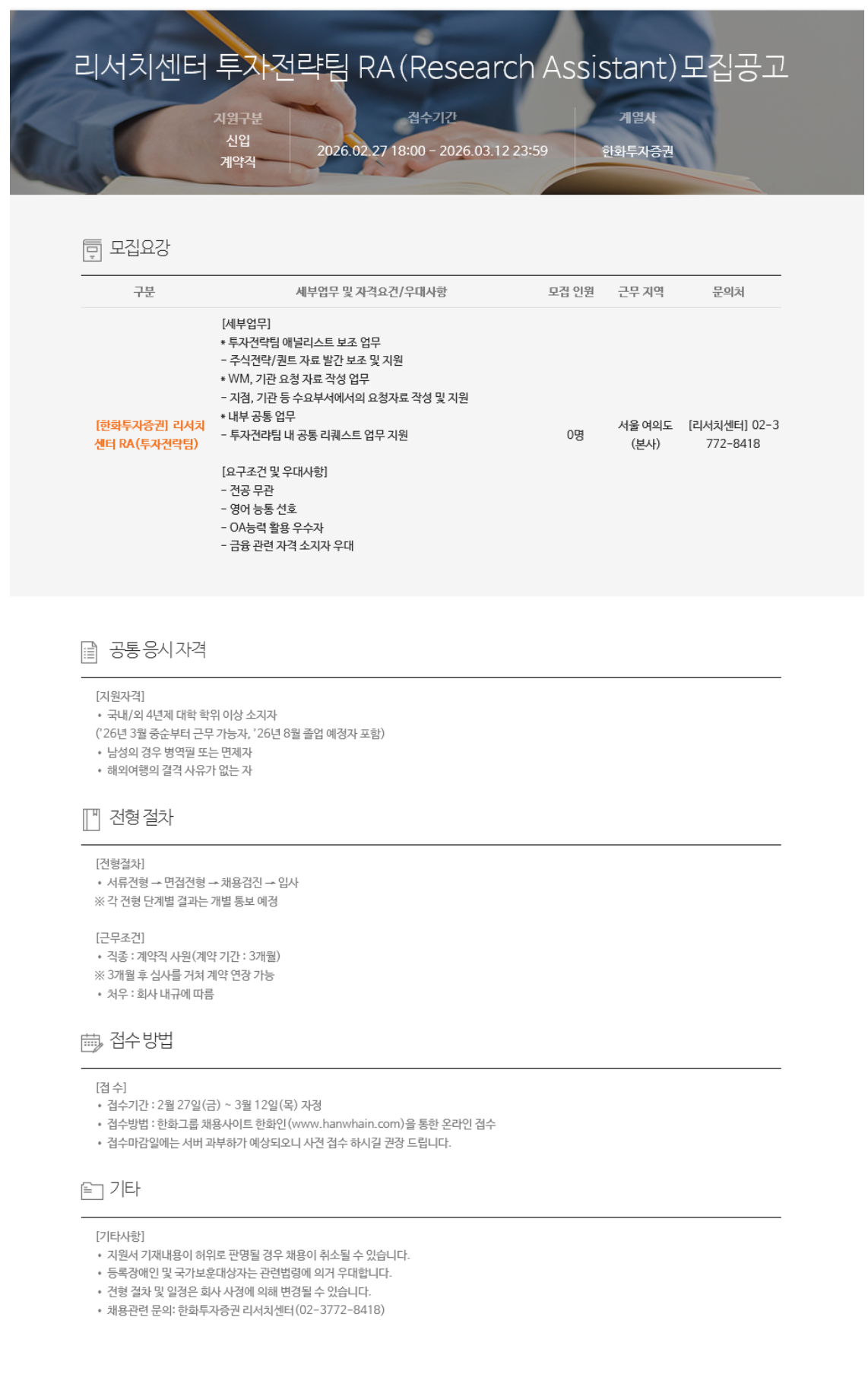 [한화투자증권] 리서치센터 투자전략팀 RA(Research Assistant) 모집 공고