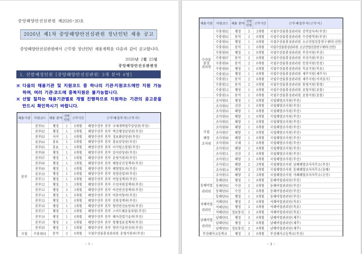 [중앙해양안전심판원] 2026년 제1차 중앙해양안전심판원 청년인턴 채용공고