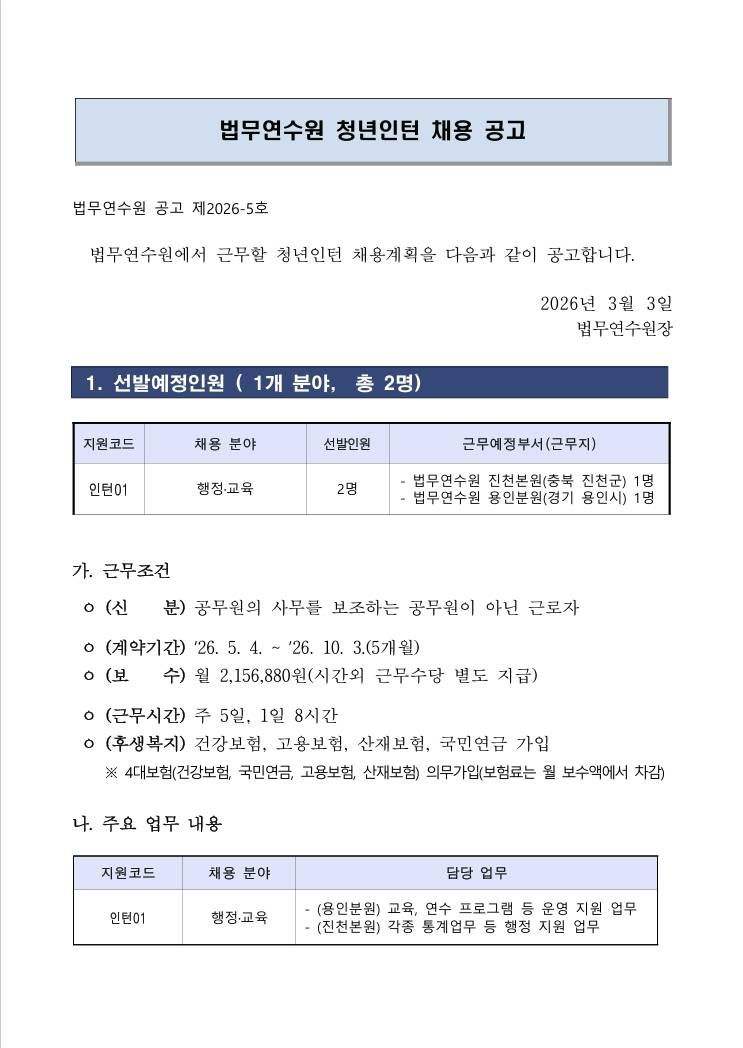 [법무연수원] 2026년 법무연수원 청년인턴 채용 공고