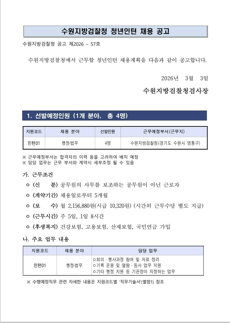 [수원지방검찰청] 2026년 수원지방검찰청 청년인턴 채용 공고