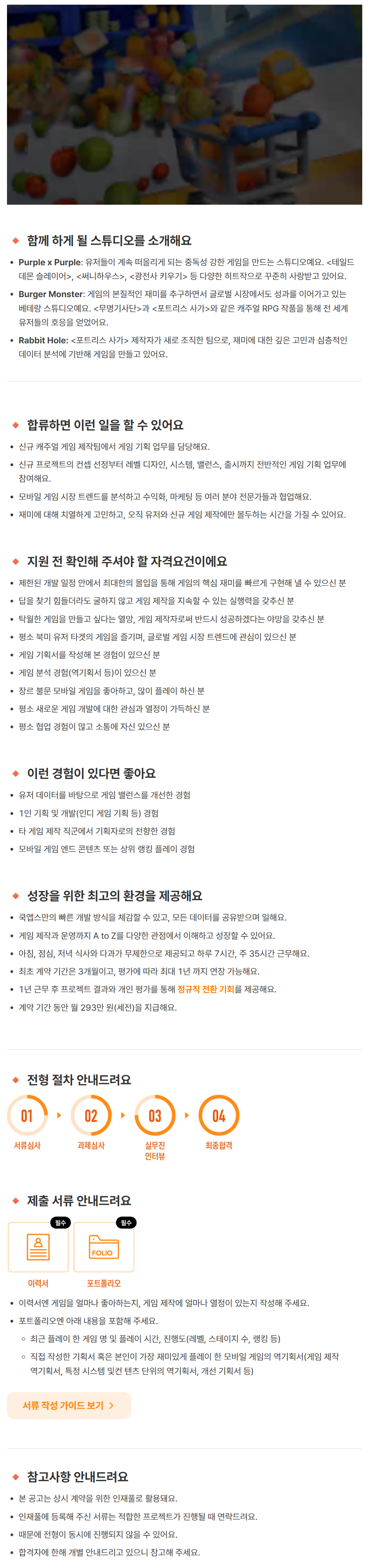 - 제한된 개발 일정 안에서 최대한의 몰입을 통해 게임의 핵심 재미를 빠르게 구현해 낼 수 있으신 분