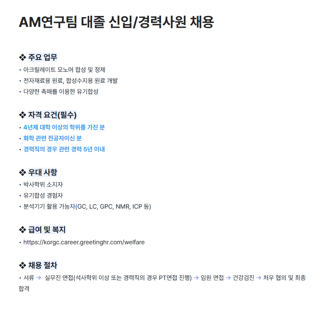 [그린케미칼] AM연구팀 대졸 신입/경력사원 채용