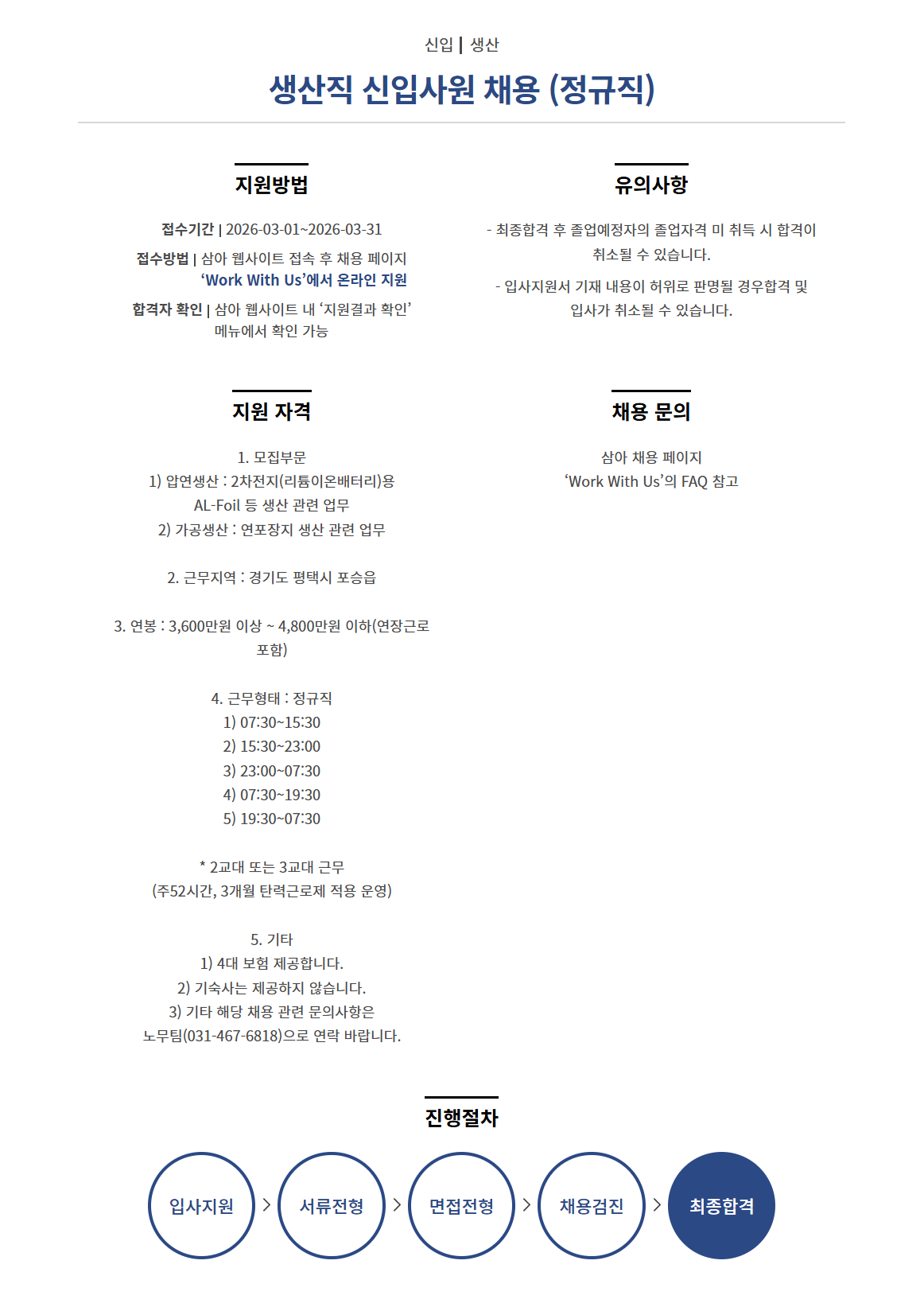[삼아알미늄] 생산직 신입사원 채용 (정규직)