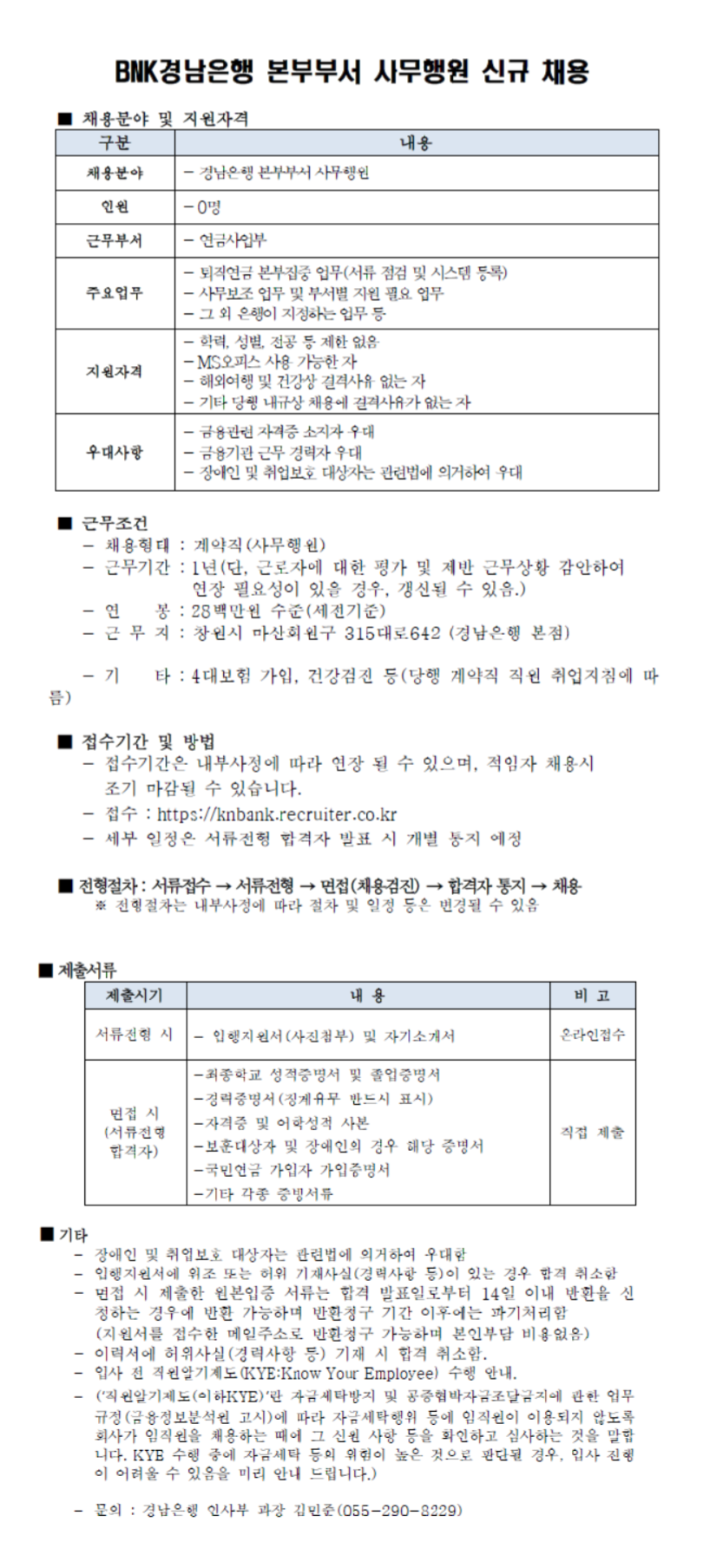 [BNK경남은행] BNK경남은행 본부부서 사무행원 채용