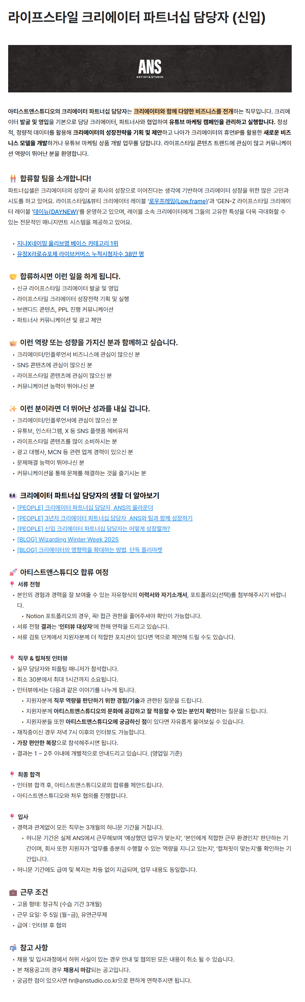 [아티스트앤스튜디오] 라이프스타일 크리에이터 파트너십 담당자 (신입)