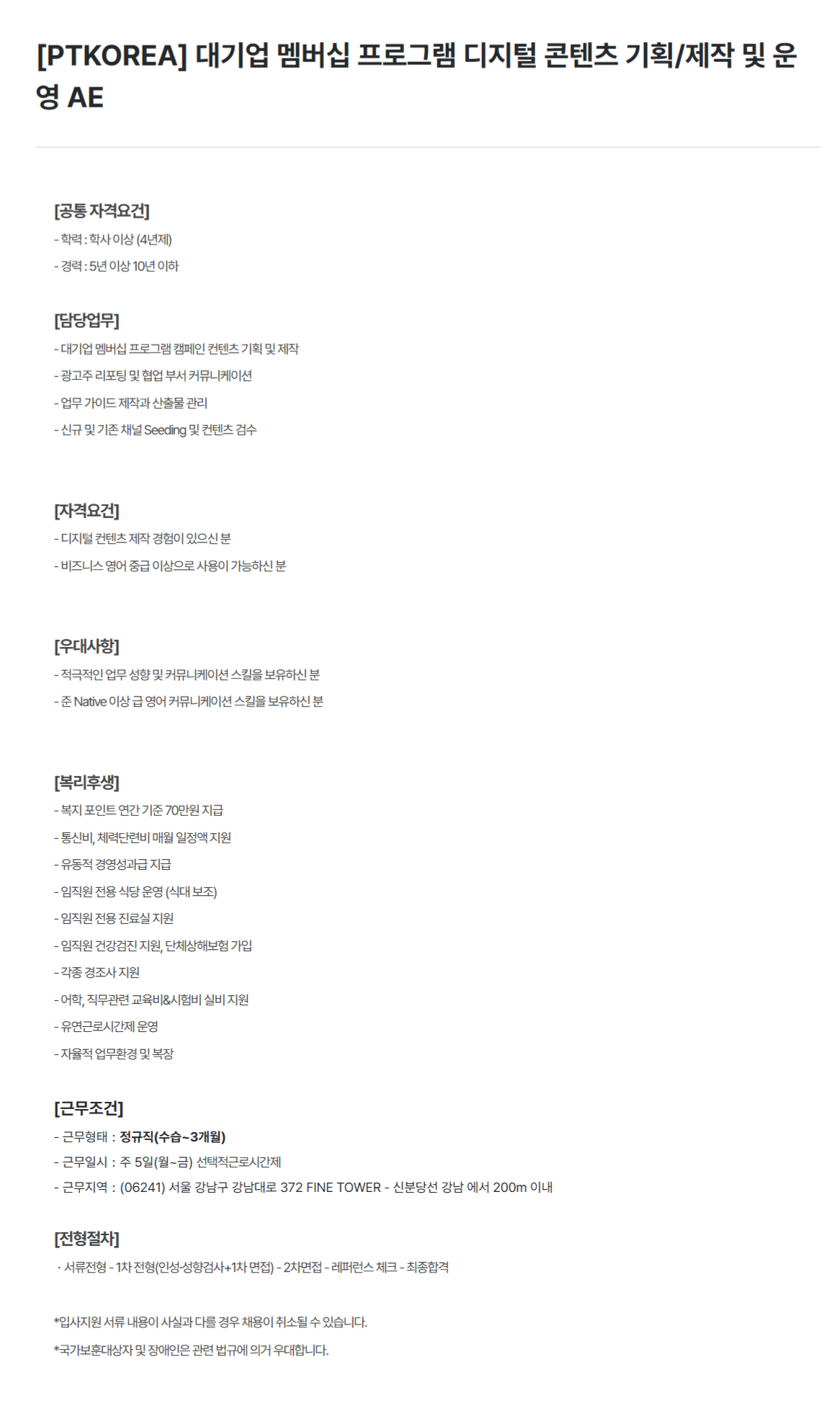 [PTKOREA] 대기업 멤버십 프로그램 디지털 콘텐츠 기획/제작 및 운영 AE