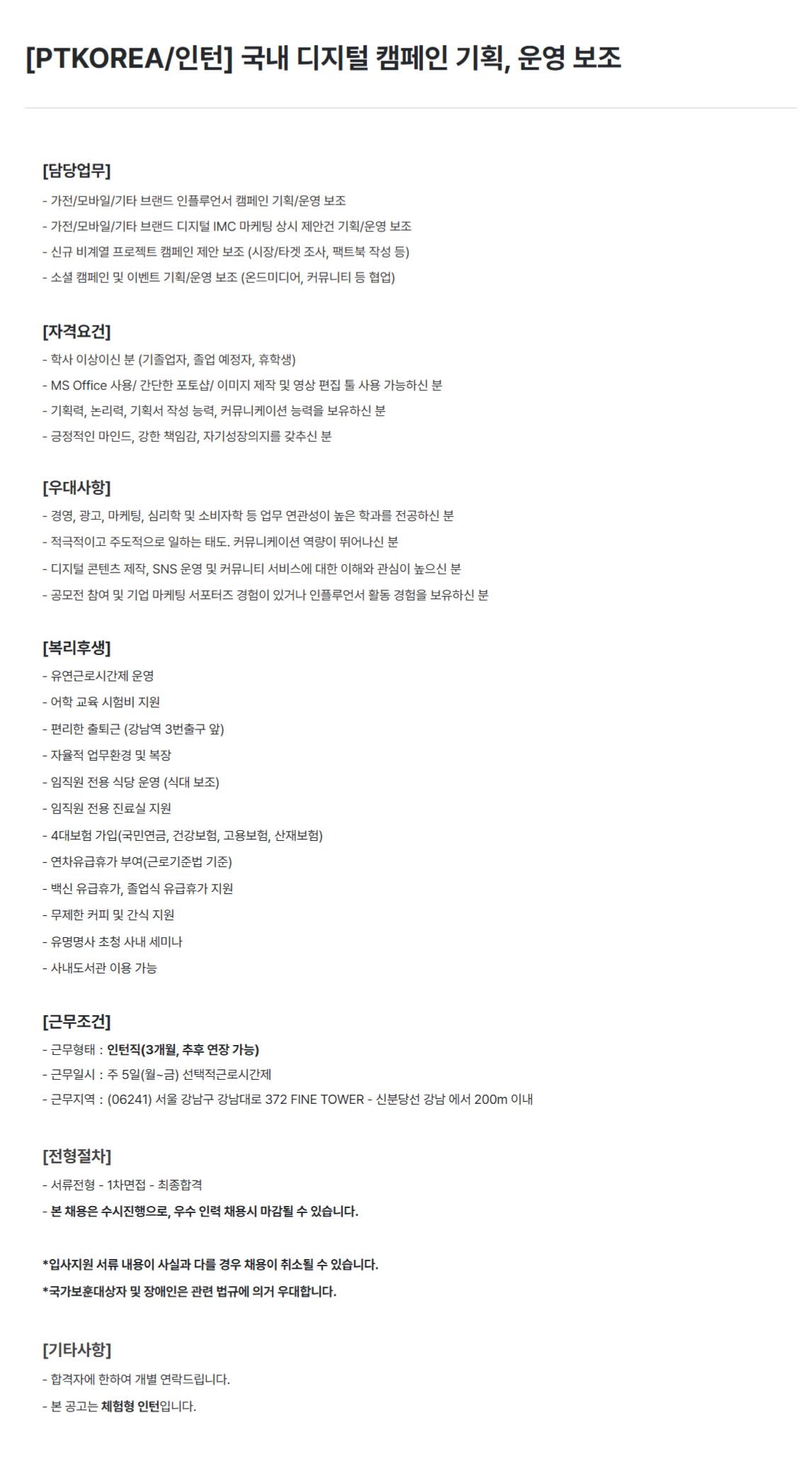 [PTKOREA] 국내 디지털 캠페인 기획, 운영 보조 - 인턴