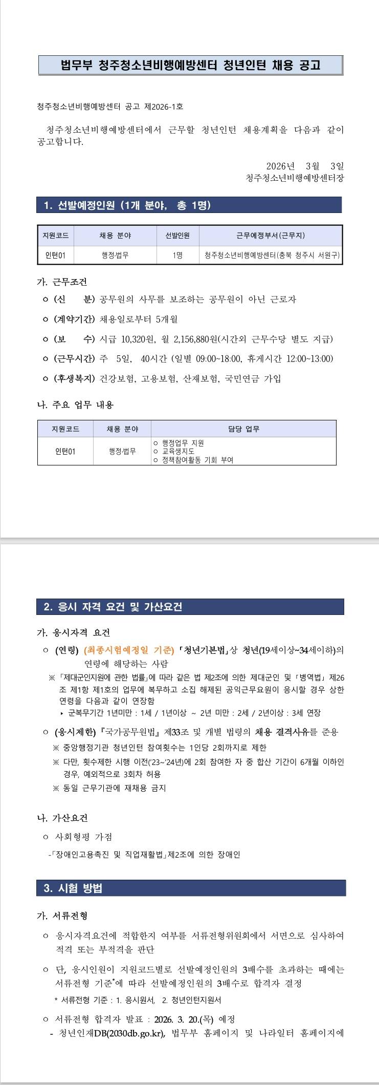 [청주청소년비행예방센터] 2026년 법무부 청주청소년비행예방센터 청년인턴 채용 공고