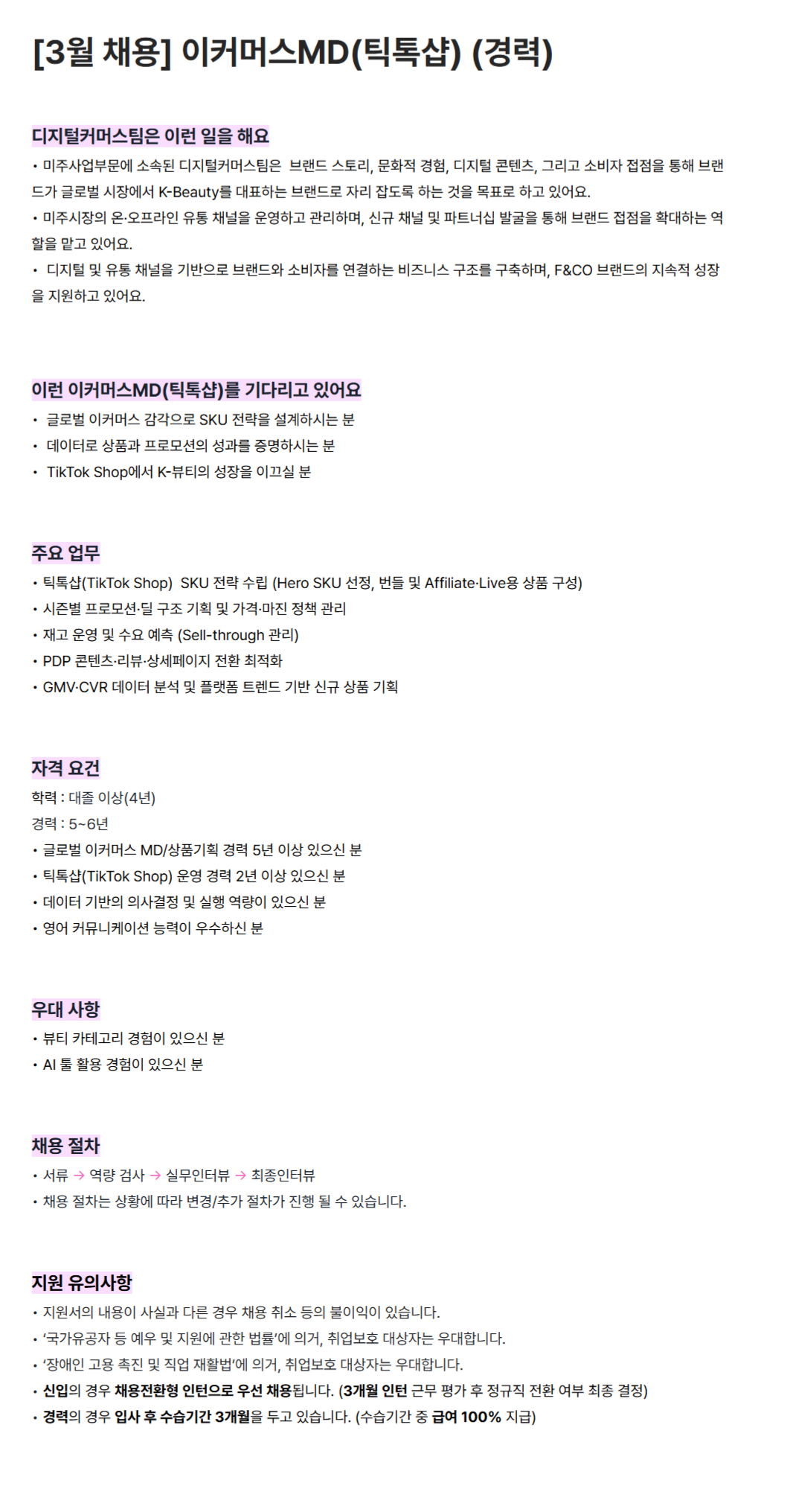 [에프앤코] (바닐라코) (3월 채용) 이커머스MD(틱톡샵) - 경력