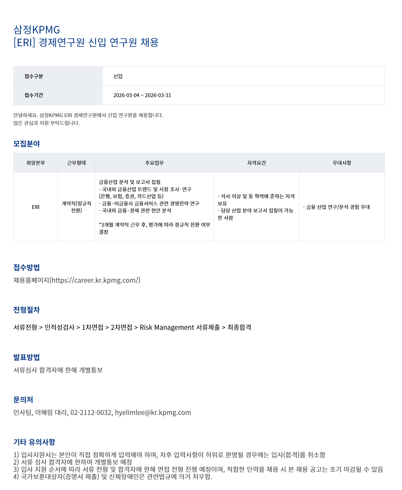 [삼정KPMG] (ERI) 경제연구원 신입 연구원 채용