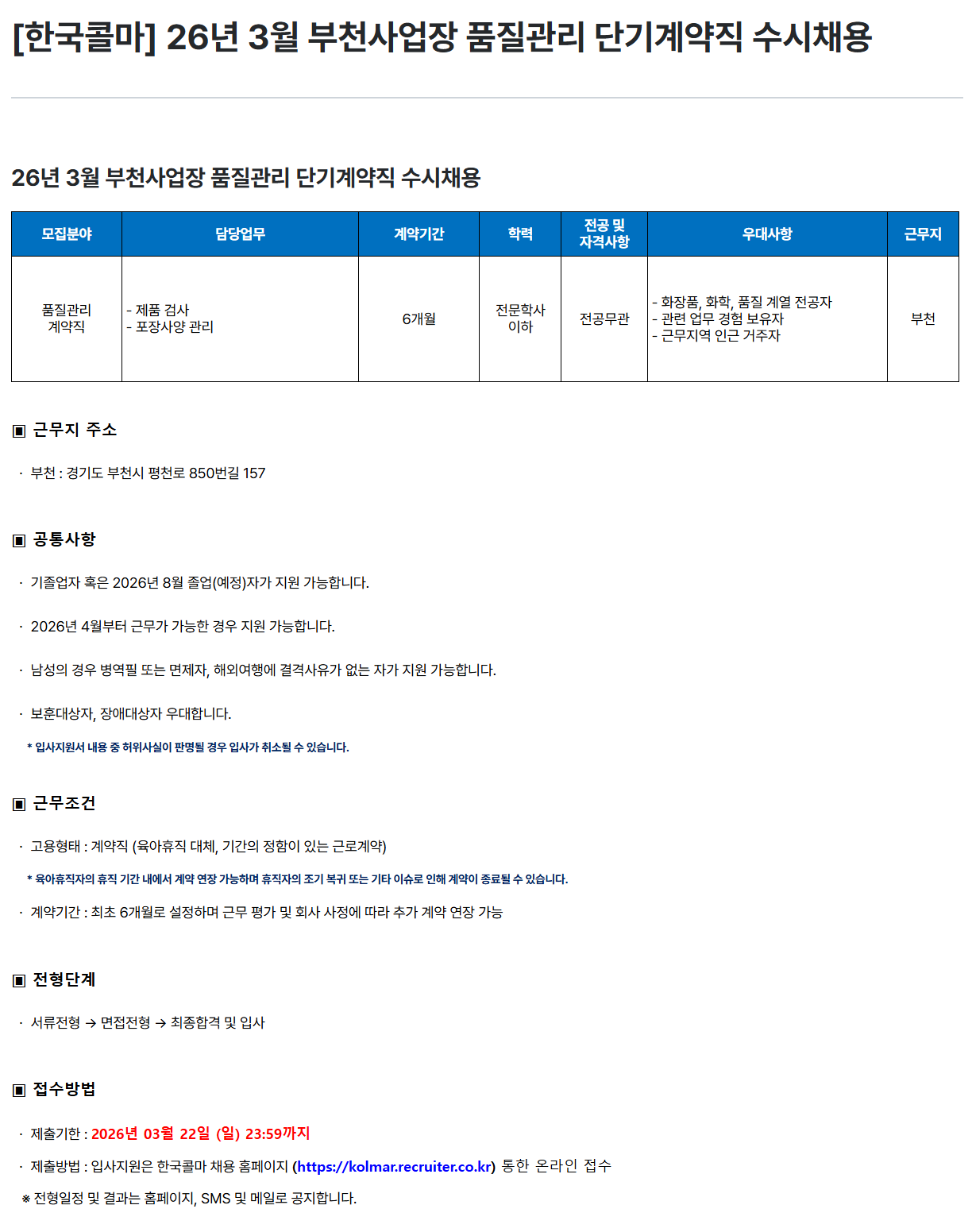 [한국콜마] 26년 3월 부천사업장 품질관리 단기계약직 수시채용