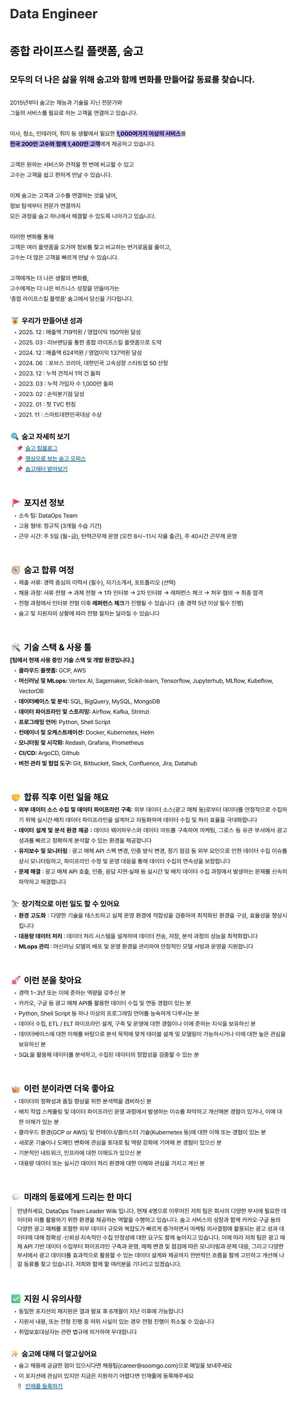 - 배치 작업 스케줄링 및 데이터 파이프라인 운영 과정에서 발생하는 이슈를 파악하고 개선해본 경험이 있거나, 이에 대한 이해가 있는 분