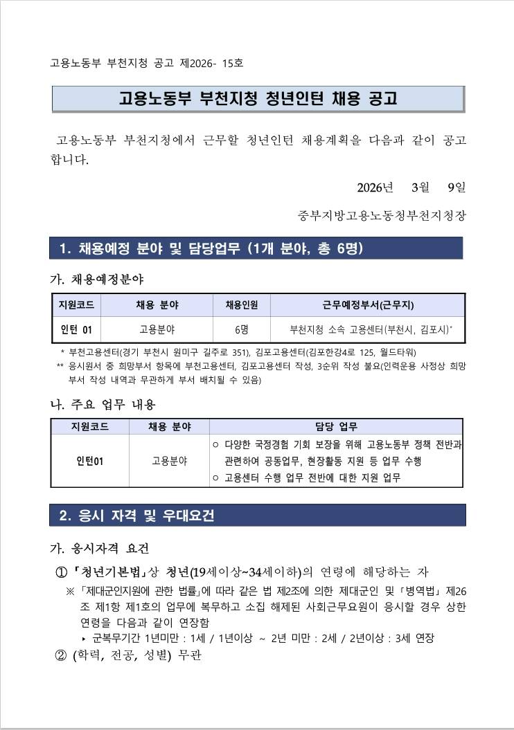 [부천고용노동지청] 2026년 고용노동부 중부지방고용노동청 부천지청 청년인턴 채용 공고