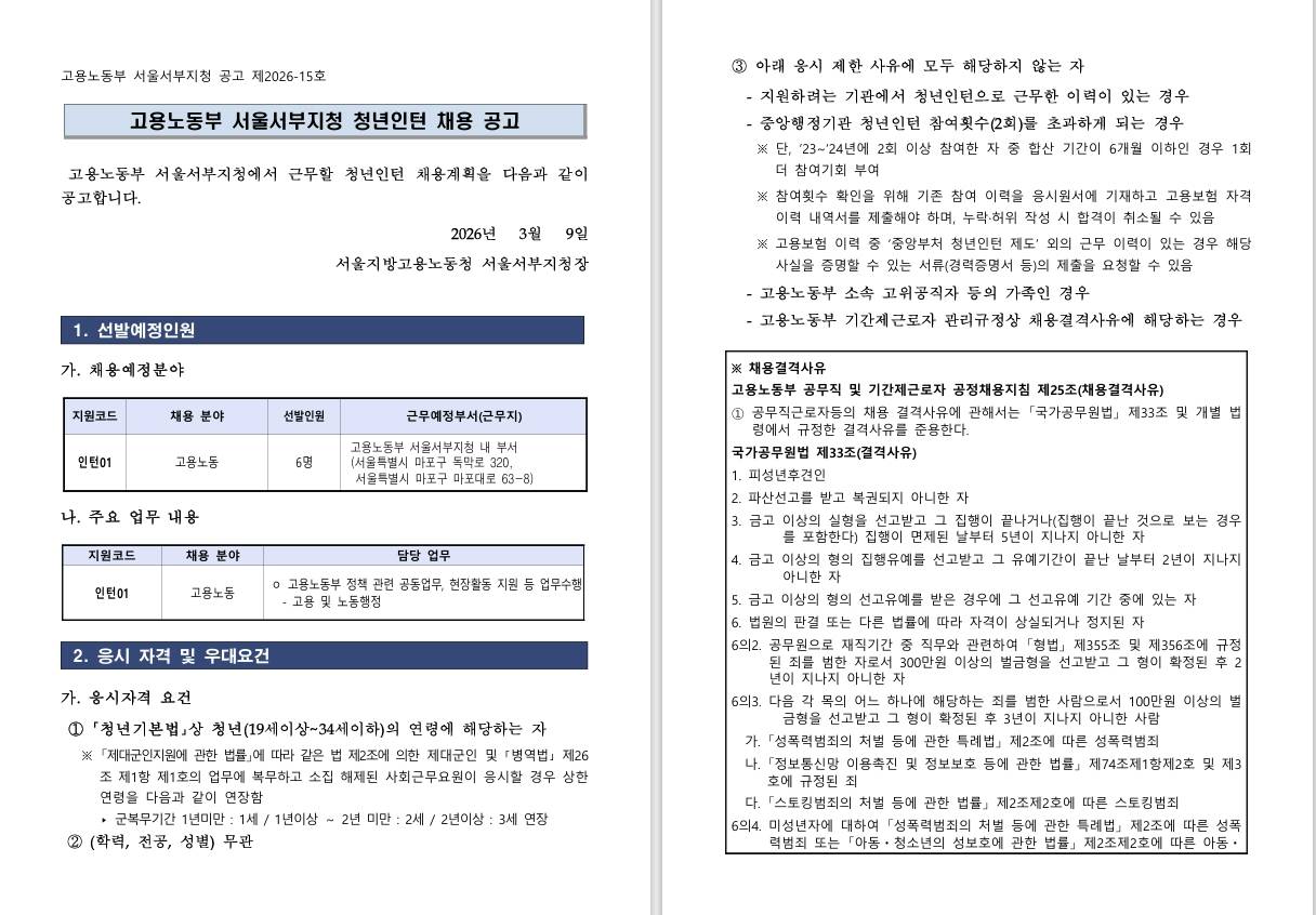 [서울서부고용노동지청] 2026년 고용노동부 서울서부지청 청년인턴 채용 공고