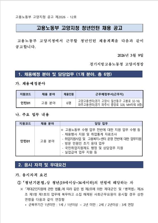 [고양고용노동지청] 고용노동부 고양지청 청년인턴 채용 공고