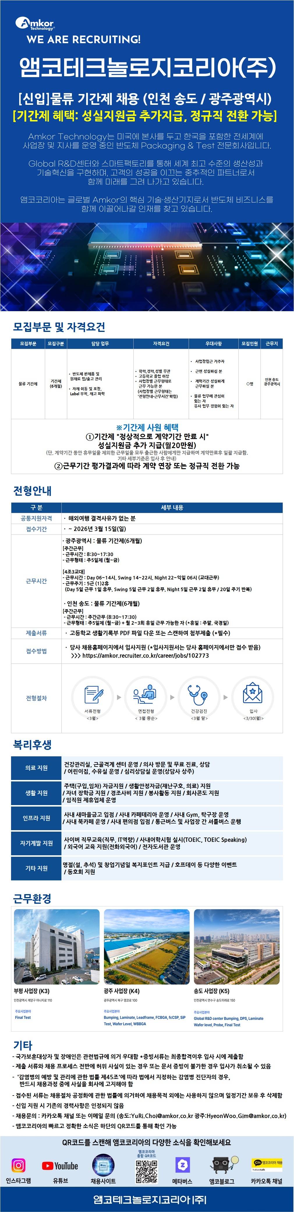 [앰코테크놀로지코리아] [신입] 물류 기간제 채용 (광주광역시, 인천 송도)