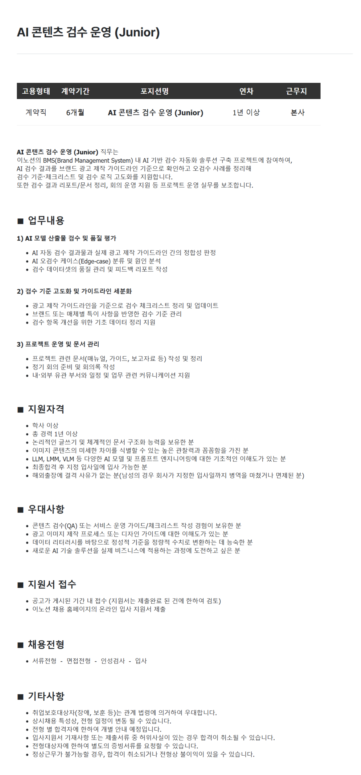 [이노션] AI 콘텐츠 검수 운영 (Junior) (계약직)