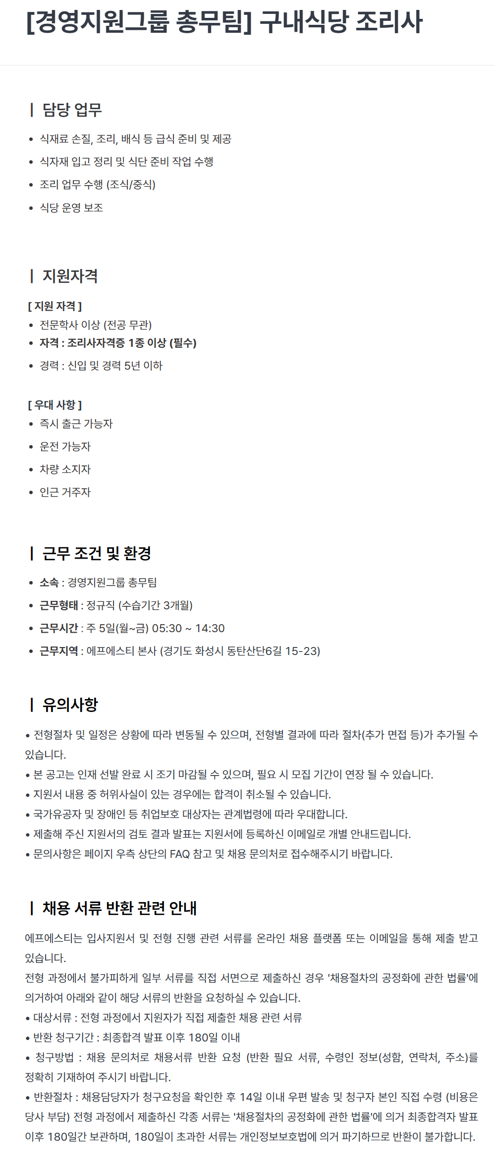 [에프에스티] [경영지원그룹 총무팀] 구내식당 조리사 채용