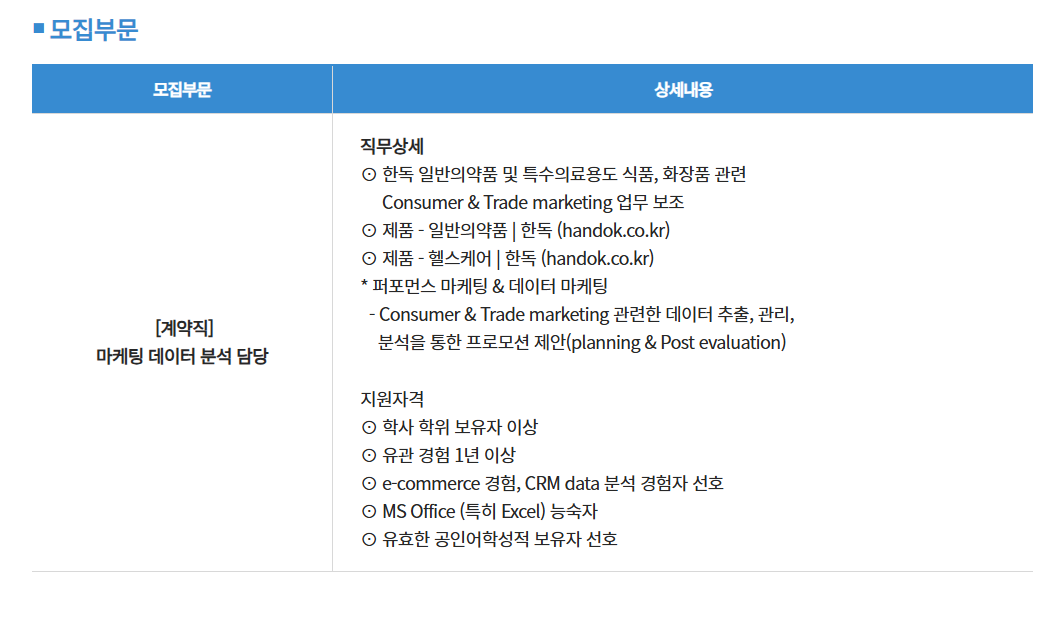 [한독] [계약직] 마케팅 데이터 분석 담당 채용