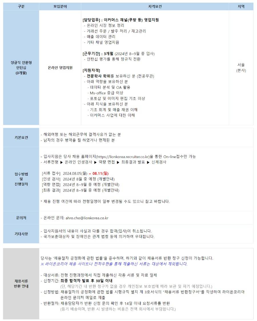 [라이온코리아] 2024년 하반기 전문대졸 인턴사원 채용