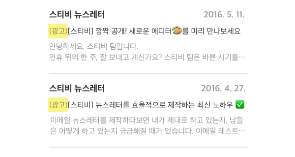 수신자의 필터링을 회파하기 위한 목적으로 빈칸, 부호 문자 등을 사용하거나 표시하는 방법을 조작하면 안됩니다. 예를 들어 (광/고), (광 고), (광.고), (“광고”), [광고]와 같이 변칙 표기하거나 특수문자를 사용하지 않아야 합니다. “(광고)지만”, (광고)인듯 광고 아닌” 등처럼 “(광고)” 뒤에 다른 말을 이어붙이는 것은 가능합니다. 스티비도 제목에 항상 “(광고)”를 붙이고 있습니다.
