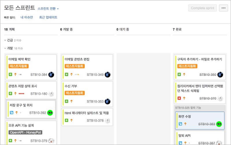 방법은 이랬습니다. 매주 1회 화요일 오전, JIRA에 기록한 스프린트 목록을 통해 지난 업무 진행 과정을 공유하고, 새로 필요한 업무는 무엇인지 2–3시간에 걸친 회의를 통해 일정을 조절했습니다. JIRA를 통해 업무를 세분화하고 일정을 세우니 업무 관리가 수월해졌습니다. 또 매주 전체 팀원들과 업무를 공유하니 장기간 팀원들과 떨어져 있어도 팀 전체 일정을 따라가는 데에 전혀 무리가 없었습니다.