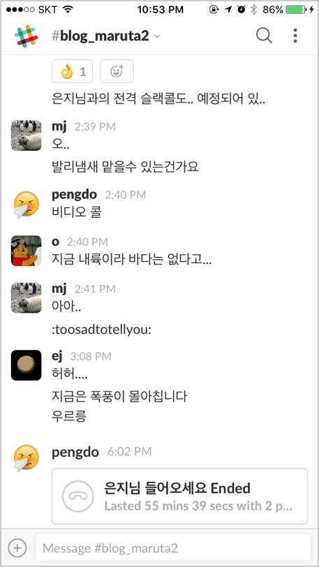 슬로워크에서는 기본 메신저로 슬랙(Slack)을 사용하고 있습니다. 위에서 설명한 것처럼 행아웃이 안 되는 상황에서 “한번 써볼까?”하고 사용해본 슬랙콜은 다른 메신저와 비교했을 때 접근성이 뛰어났습니다. 일단 모두가 슬랙을 사용하고 있어 메신저에서 팀원을 추가해 전화를 걸기만 하면 끝. 이런 간단한 방법으로 사용할 수 있는 슬랙콜은 7–8명이 모여 슬로워크 블로그 기획회의를 할 때도 유용하게 활용했습니다(회의 때마다 슬랙콜 뒤로 들려오는 새소리에 모두 경탄을 금치 못했지요).