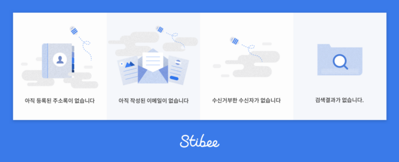 기존에는 빈 페이지, 발송 완료 등 이미지가 필요한 부분에 이모지와 노란 꿀벌 로고를 활용했는데요, 스티비 정식버전에서는 기존의 노란색에서 벗어나 컬러와 이미지를 변경했습니다. 이를 가장 잘 볼 수 있는 페이지가 바로 empty-state, 즉 사용자가 가입한 이후 아직 서비스에서 요구하는 정보를 입력하지 않은 ‘빈 페이지’입니다. 이 페이지는 사용자가 가입한 후에 어떤 행동을 해야하는지를 안내하는 것이 주 목적입니다. 안내에 따라 사용자가 정보를 등록하면 더 이상 만날 수 없지만, 짧게 접하는 시간과 반대로 사용자의 이어지는 행동을 어떻게 유도할지 많이 고민해야 하는 페이지입니다.