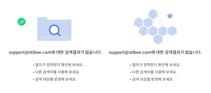주소록에서 사용자를 검색할때 정보가 없는 경우에도 ‘정보 없음’을 일러스트로 보여줍니다. 최종 선택된 시안은 직관적인 이미지로 ‘폴더’와 ‘돋보기’를 사용했습니다. 반면 탈락된 오른쪽 시안은 아무것도 없는 벌집을 돌아다니는 벌 이미지로 이미지를 만들었습니다.