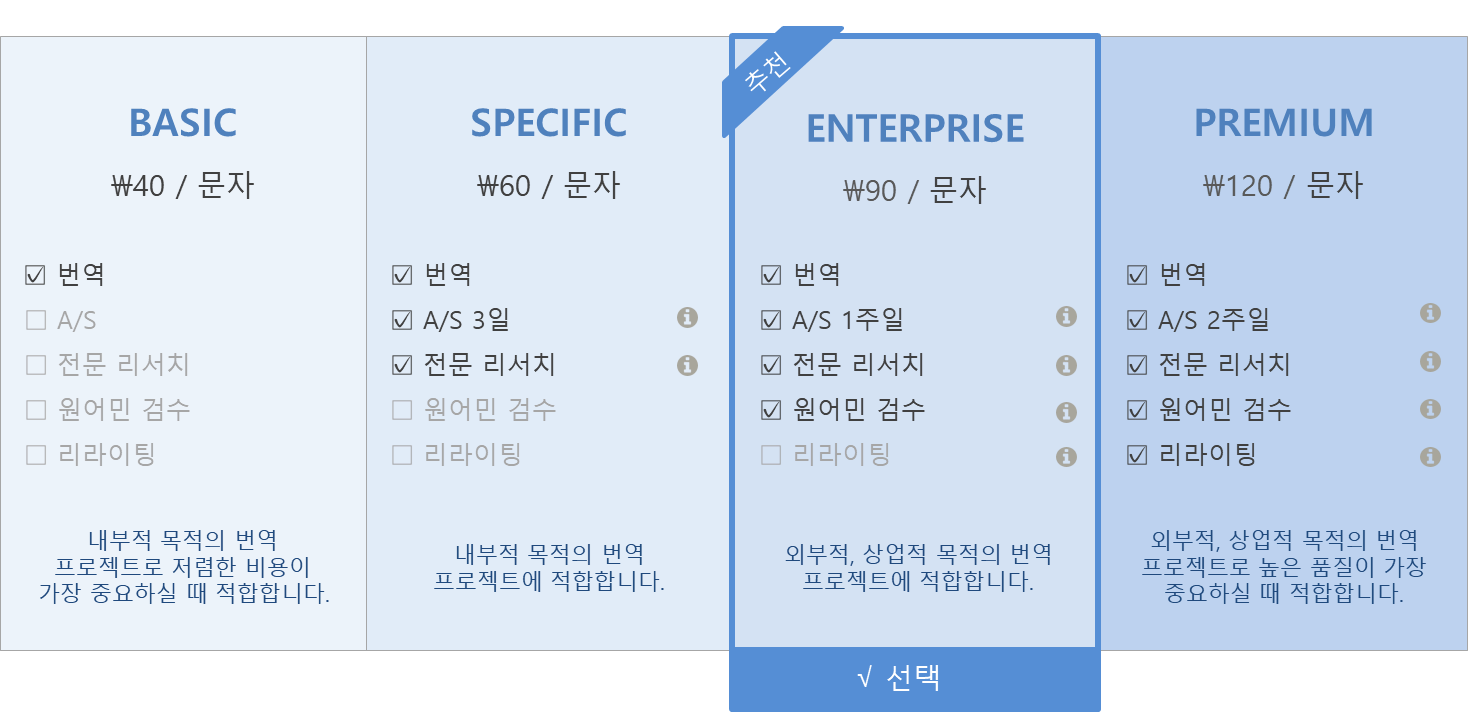 이 문제에 대한 솔루션으로 고객이 직접 고르고 결제하는 ‘네 가지 번역 상품 팩’이 탄생했습니다.