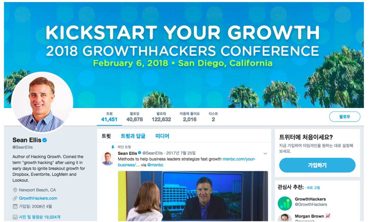 션 엘리스는 Growth Hacking이란 용어를 만든 장본인으로 Dropbox 마케팅, Eventbrite, Logmein, Uproar 등 마케팅 활동을 이끌어 시가총액 10억달러 (약 1.1조원) 이상으로 성공시킨 실리콘밸리 최고의 마케터이자 그로스해커이다. 그는 고객정보 분석, 설문조사 기업인 콸라루의 설립자이자 CEO로 수백만달러의 매출을 올리고 성공적으로 매각한 경험도 있다.