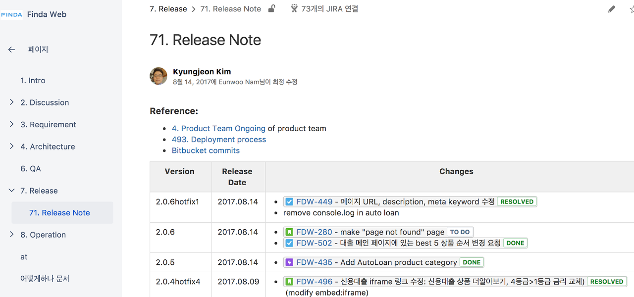 위키 시스템 Confluence를 통해 회사 및 프로젝트의 날리지를 관리합니다.