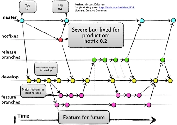 동시에 여러 버전의 소스를 유지하고, 여러 사람이 협업하기 위해 위와 같은 Git flow를 준수합니다.