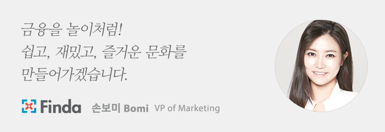 시간이 부족하니, 효율적으로 공부하고 활용해야겠다는 생각. 핀다에 조인하면서 제 재정운영현황도 다시 돌아보게 되고, 미래를 좀 더 현실적으로 계획하는 시간을 가지는 게 너무 재밌습니다. 제가 재밌게 느끼고 남들에게도 필요하다고 느끼는 정보들은 핀다의 홈페이지, 블로그, 페이스북 등을 통해 다양한 금융 컨텐츠를 큐레이션해서 드리오니 꼭 한 번 확인해보세요. (어떠한 피드백도 언제든지 환영입니다 :)